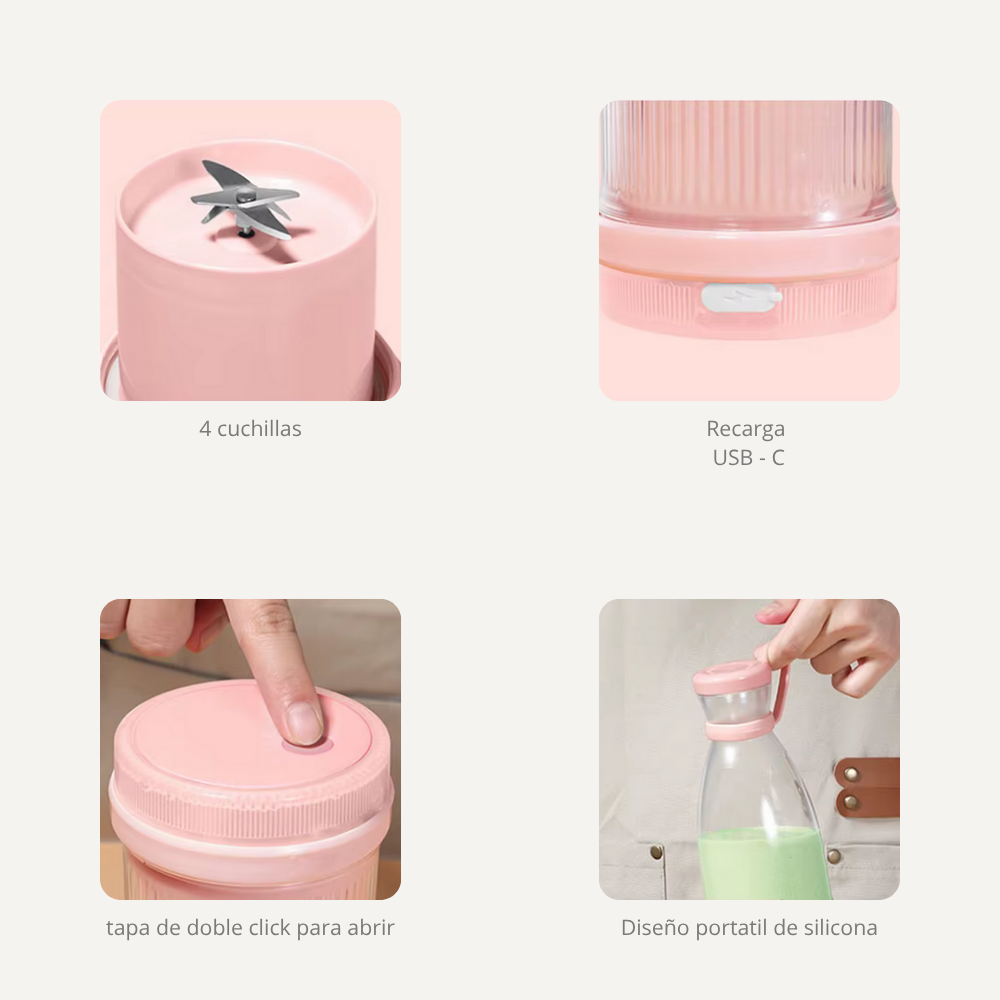 Mini Licuadora Portátil USB – 420ml: nutrición portátil para mujeres que se cuidan sin detenerse. Esta mini licuadora es el aliado perfecto para quienes transforman su alimentación en un gesto de bienestar diario. Con capacidad de 420 ml y cuchillas de acero inoxidable, permite preparar batidos, jugos o mezclas suaves en segundos, estés donde estés.