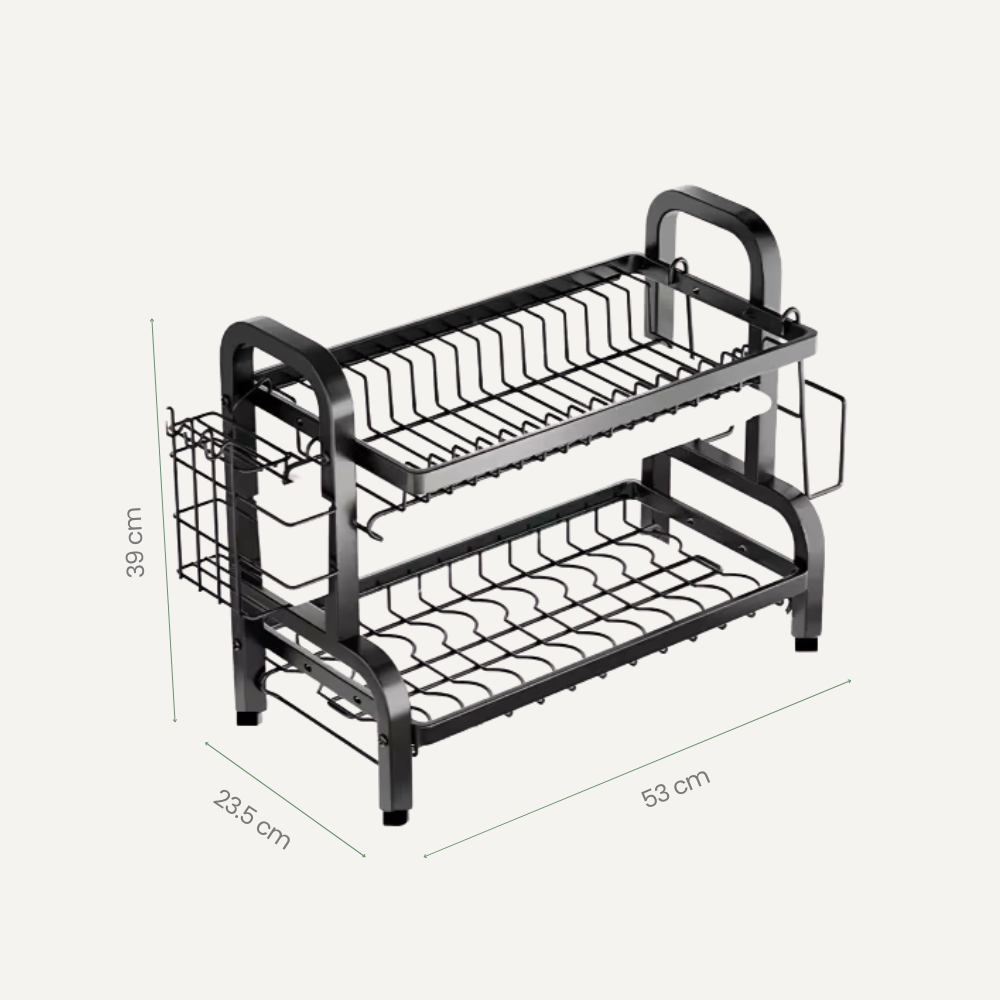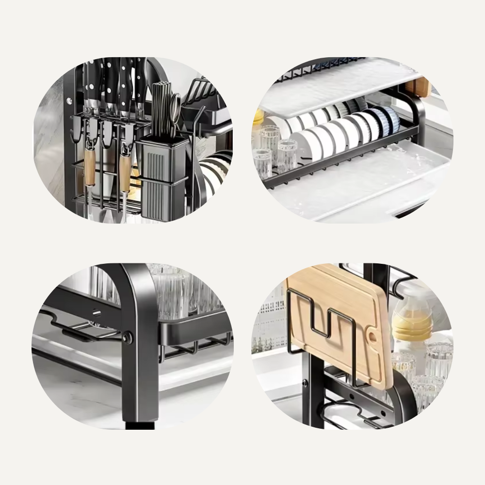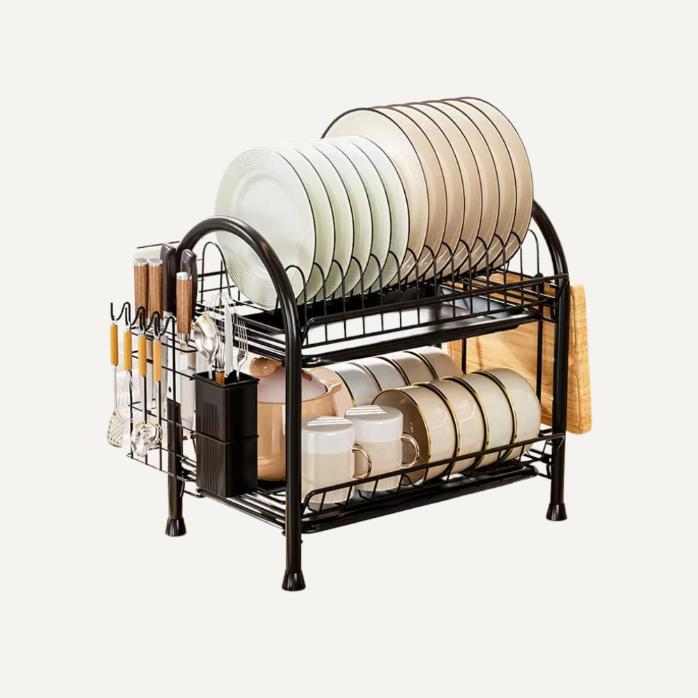 Su estructura vertical optimiza el espacio sobre el mesón, mientras que la bandeja inferior recoge el agua sin derrames. Ideal para cocinas pequeñas o para quienes desean mantener el orden sin sacrificar estilo. Cada plato que se seca aquí es parte de una rutina que respira calma.